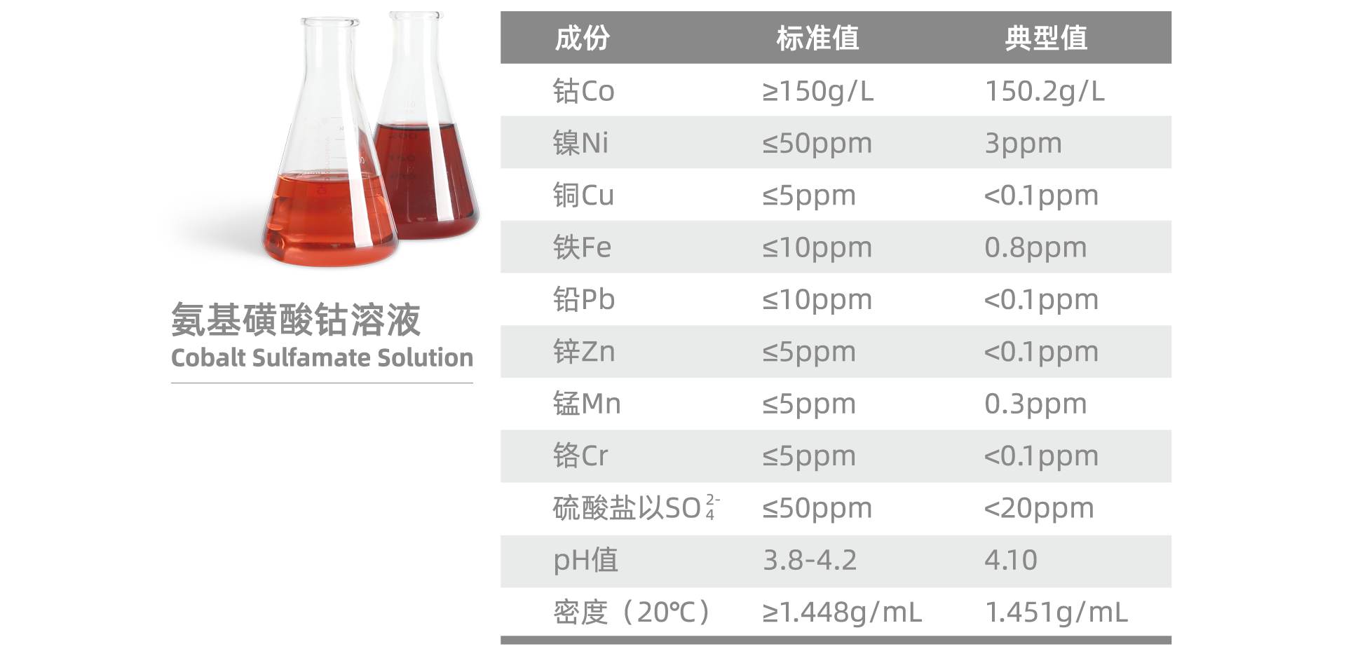 氨基磺酸鈷溶液(Cobalt Sulfamate Solution) 分 子 式:Co(NH2SO3)2 分 子 量:250.99 性 狀:紅色透明液體。 用 途:主要用于精密電鍍、電鑄、電子工業(yè)等。 包 裝:HDPE桶裝,每桶30公斤。 儲(chǔ) 運(yùn):運(yùn)輸時(shí)包裝要密閉,運(yùn)輸過(guò)程中防止受熱,貯存在陰涼,通風(fēng)處